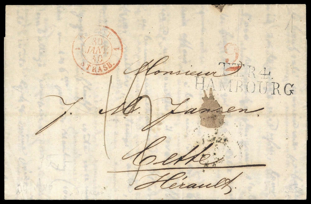 1840, Faltbrief inkl. Inhalt mit schwarzem Zweizeiler "TR4. / HAMBURG" nach Cette / Frankreich, entsprechende vorder- und rückseitige Stempelvermerke