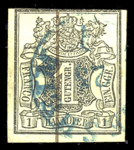 1851, 1 Ggr. schwarz/oliv, oben tangiert, sonst vollrandig mit Tintenstrichvorausentwertung und blauem K1 von Hildesheim