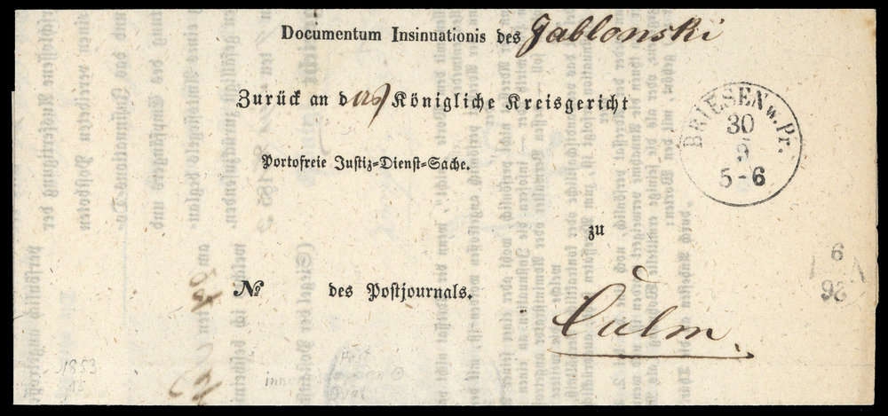 1853, Gerichtsdokument mit K1 "BRIESEN w.Pr. 30/9 5-6" nach Cöln, leichte Bugspuren.