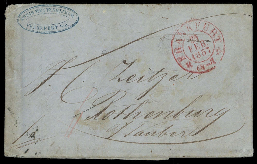 1857, Brief mit rotem K2 "FRANKFURT 25 FEB. 1857", adressiert nach Rothenburg, rückseitig diverse Stempelvermerke, stärkere Alterungs- und Stempelspuren.