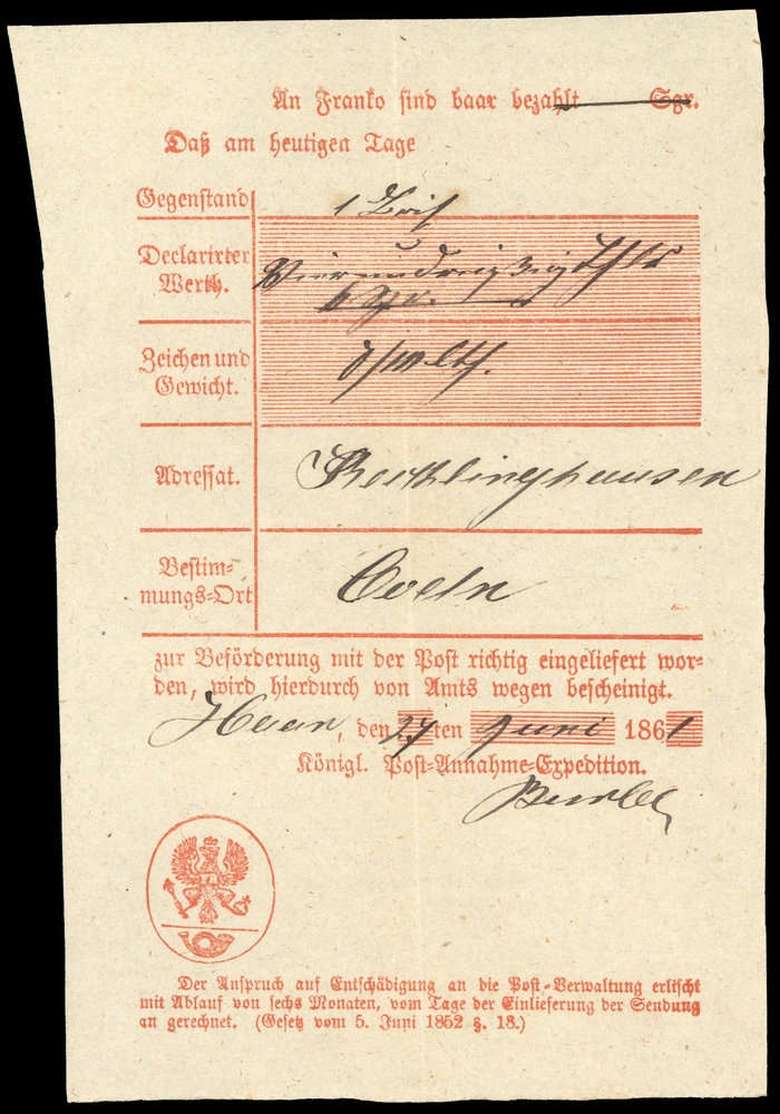 1861, roter Post Einlieferungsschein für einen Brief nach Coeln, hs. Haaren, senkr. Faltung, Gebrauchsspuren