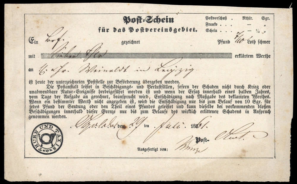 1861, vorgedruckter POST-SCHEIN FÜR DAS POSTVEREINSGEBIET von APOLDA 29.7.1861, diverse hds. Eintragungen, Bug- und stärkere Alterungsspuren.
