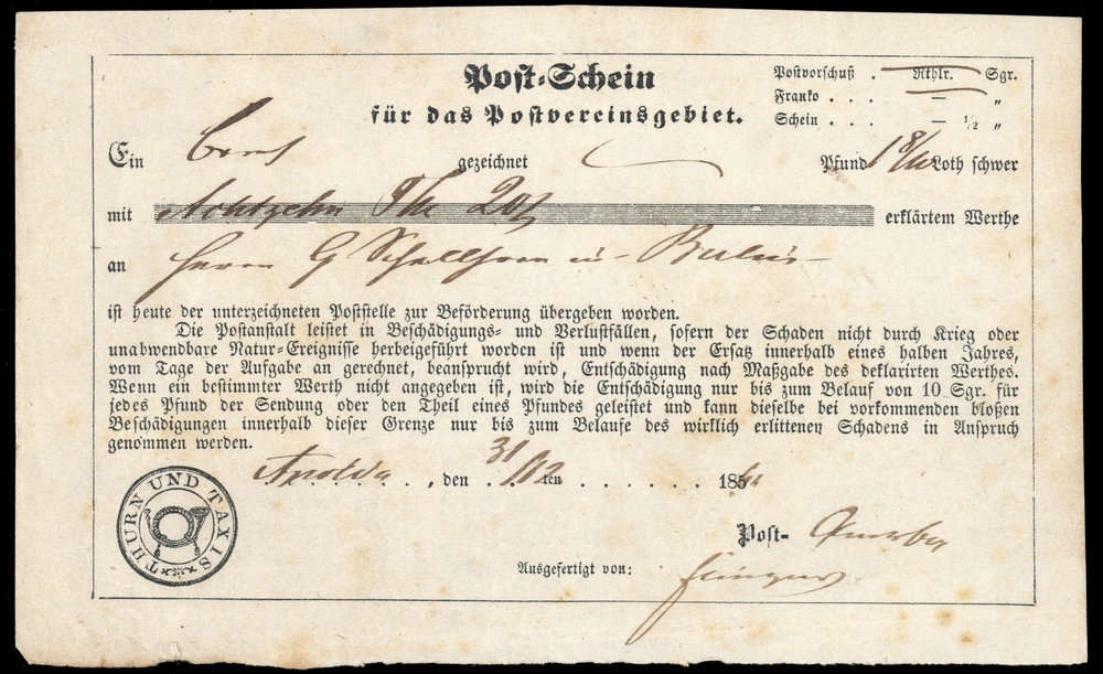 1861, vorgedruckter POSTSCHEIN für das Postvereinsgebiet von APOLDA 31.12.1861, stärkere Alterungsspuren und leichte Randspuren.
