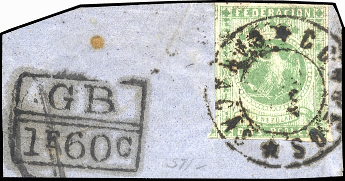 1863, 2 R. Adler, vollrandig auf Briefstück mit K2 "Caracas" und nebengesetztem englischem Stempel, ex Bustamante