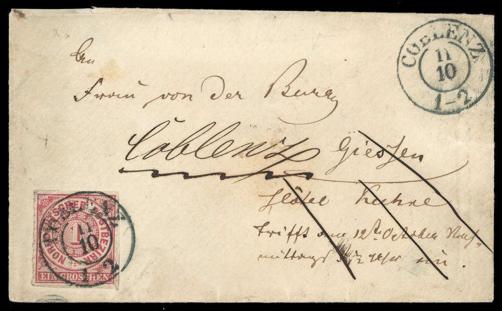 1868, 1 Gr karmin, Scherentrennung, K2 "COBLENZ 11 10", Beförderungs- Altersspuren, Damensiegelbriefchen, an Frau von der Burg, Abs.: Hauptmann von der Burg, hs. "retour"