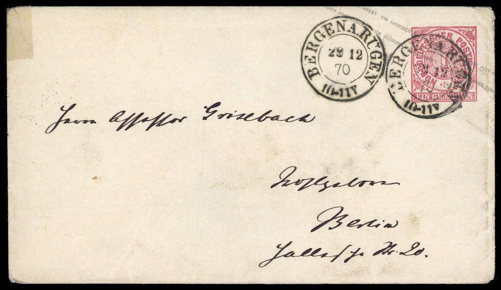 1868/71, 1 Gr rosa/grau, GAU, K2 "BERGEN A. RÜGEN 29 12 70", rs. Siegel, vs. l.o. Tesafilm, Beförderungs- Altersspuren, nach Berlin