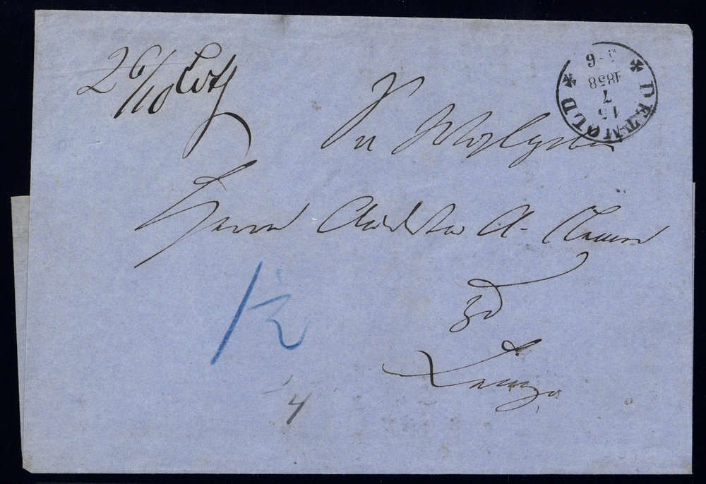 1868, markenloser Brief mit klarem K1 "DETMOLD 15 7 1858", adressiert nach Lemgo, rs. ZWEIZEILER-Ankunftsstempel, leichte Alterungsspuren.