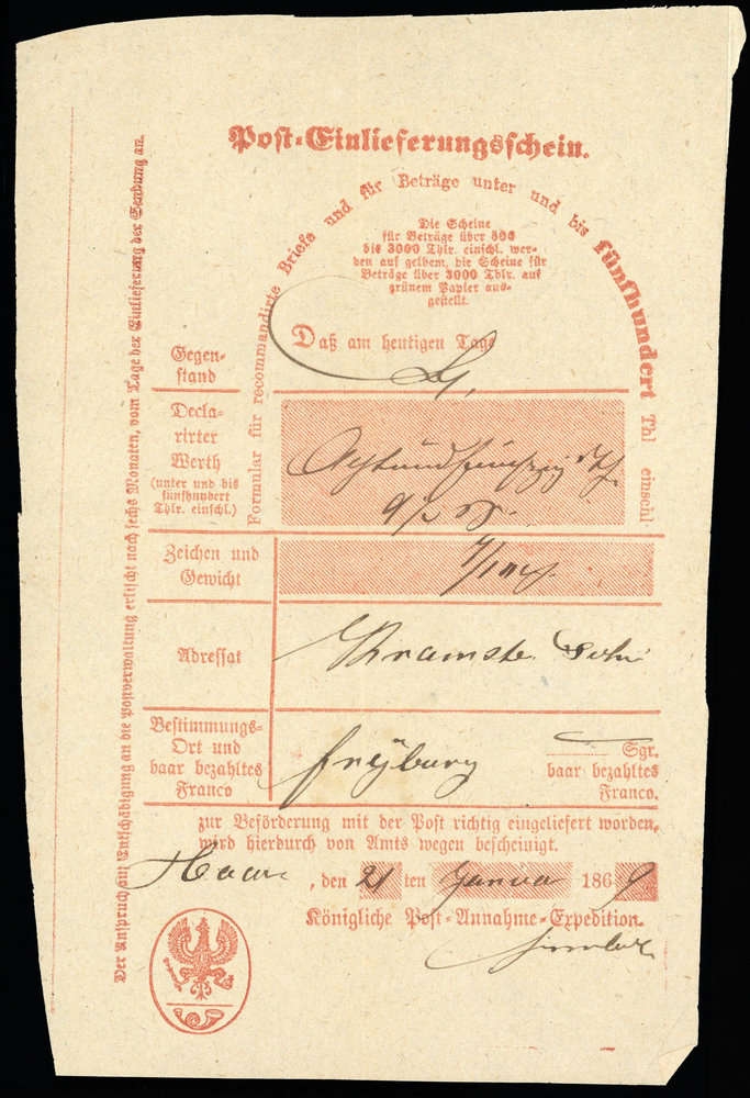 1869, roter Post Einlieferungsschein für einen Brief nach Freyburg, hs. Haaren, senkr. Faltung, Gebrauchsspuren