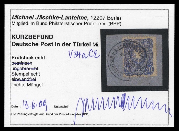 1875, 20 Pfg. Reichsadler als Vorläufer auf Briefstückchen in der Variante "aCE", aktueller Farb- Kurzbefund Jäschke-L. BPP vom 13.06.2009