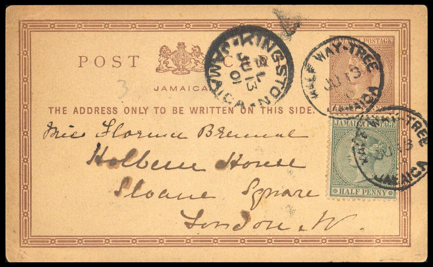 1877, 1/2 P rotbraun, GSK Viktoria, 1/2 P grün Zusatz, K1 "HALF WAY TREE JU 13 01", Alters- Beförderungsspuren, nach London