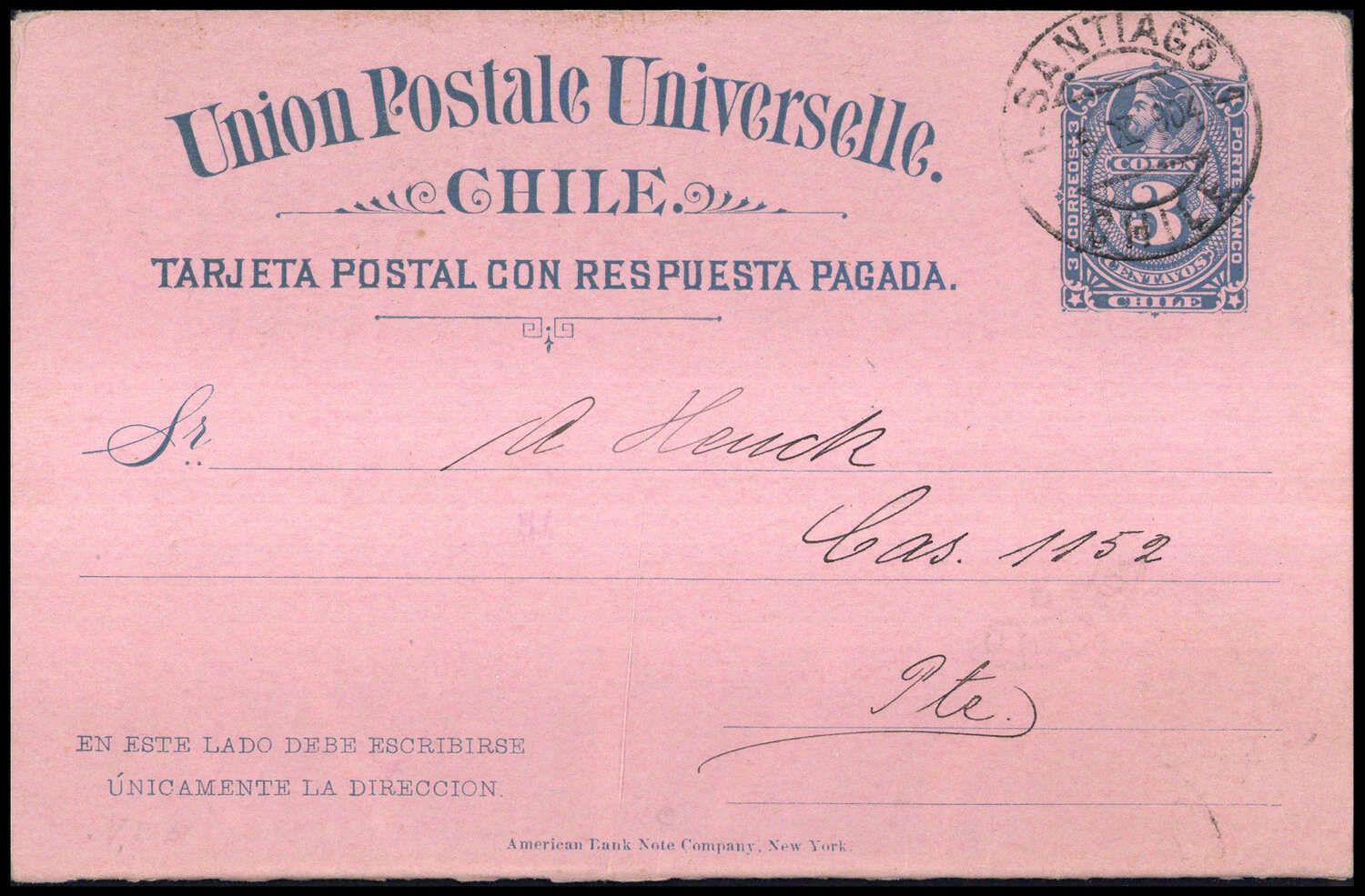1884, 3+3 C blau/dunkelrosa, Doppelkarte Kolumbus/, K1 "SANTIAGO 26 X 904", Beförderungs- Altersspuren, Antwortteil K1 "SANTIAGO 28 X 904", ohne Text