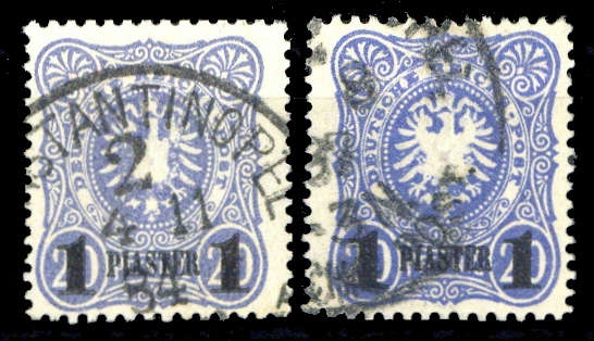 1884, 1 PIA auf 20 Pfg. Reichsadler gestempelt in 2 Farbnuancen