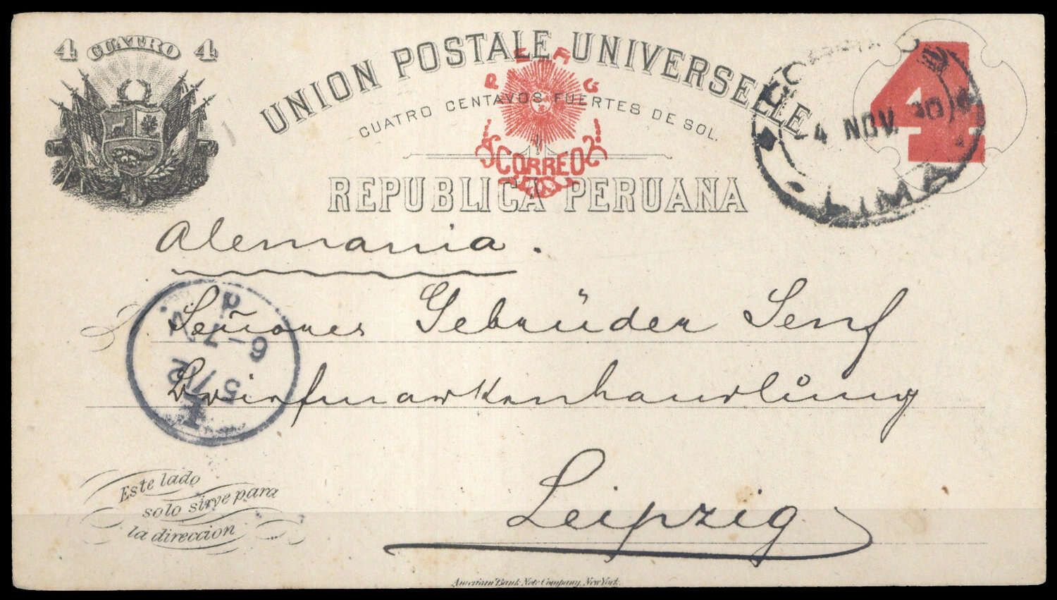 1884, 4 C schwarz, weiß, hellrot, GSK Wappen/Sonne, Type II, Oval "LIMA 4 NOV 90", Beförderungs- Altersspuren, nach Leipzig, K1 " I 5/12"