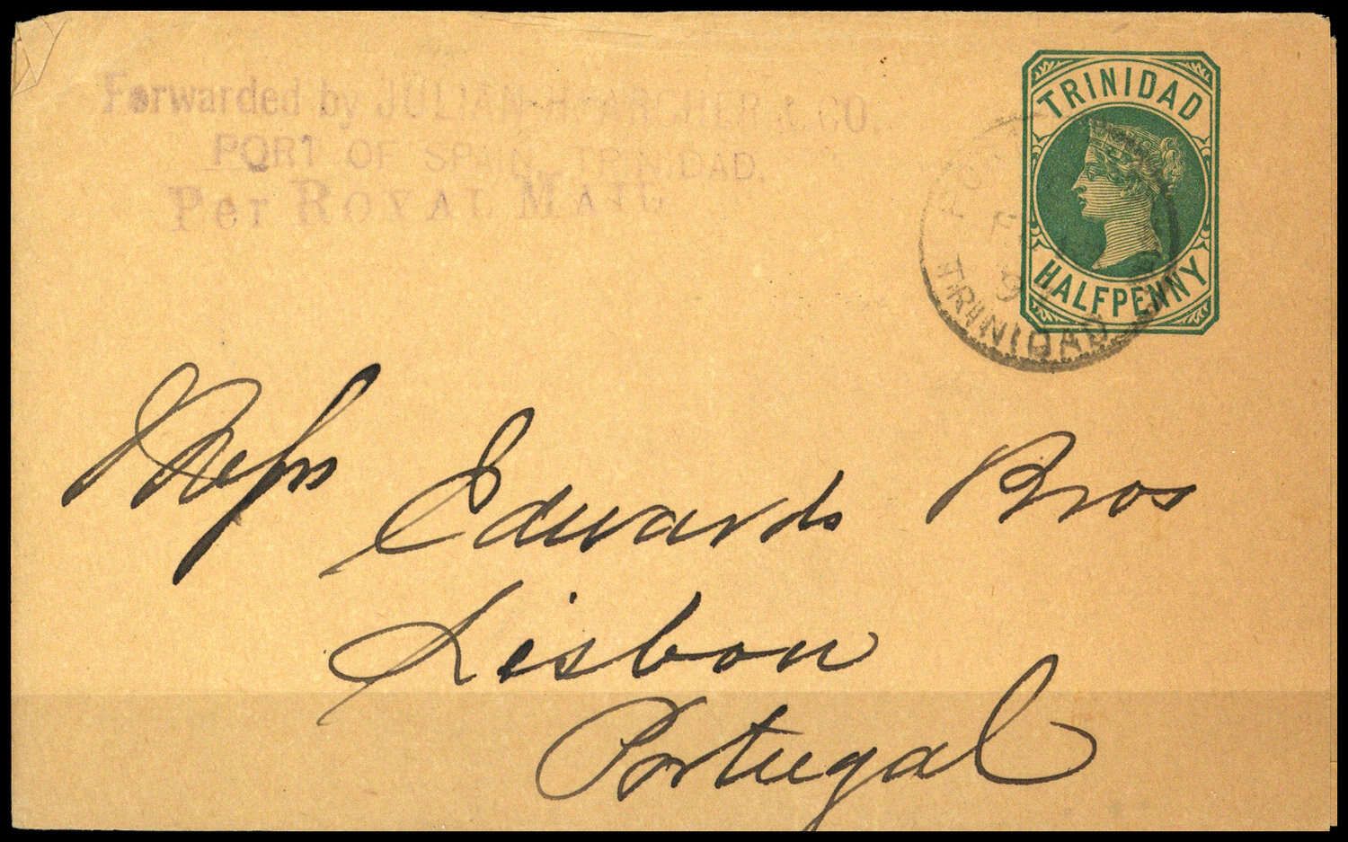1884, 1/2 P grün, Streifnand Viktoria im Rahmen, K1 "PORT OF SPAIN FE 13 97", Alters- Beförderungsspuren, nach Lissabon, Ak "7-3-97"