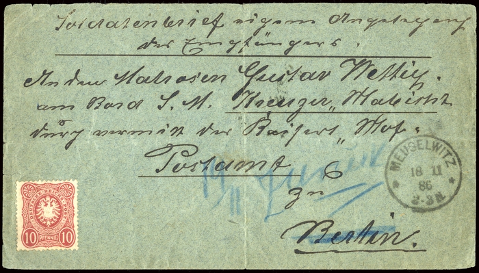 1886, Hofpostamtsinhaltsbrief vom 18.11.1886 aus Neuselwitz an einen Matrosen auf dem Kanonenboot S.M.S. "Habicht", das sich zu dieser Zeit vor Westafrika aufhielt. Der Brief wurde unfrankiert aufgegeben. Dies war jedoch nur erlaubt, wenn sich das Schiff in den Heimatgewässern aufhielt. Am Absenderort wurde eine 10 Pf Marke aufgeklebt, die jedoch nicht mehr entwertet wurde. Das Kanonenboot war in dieser Zeit hauptsächlich vor Kamerun stationiert, wo es immer wieder zu Unruhen kam.