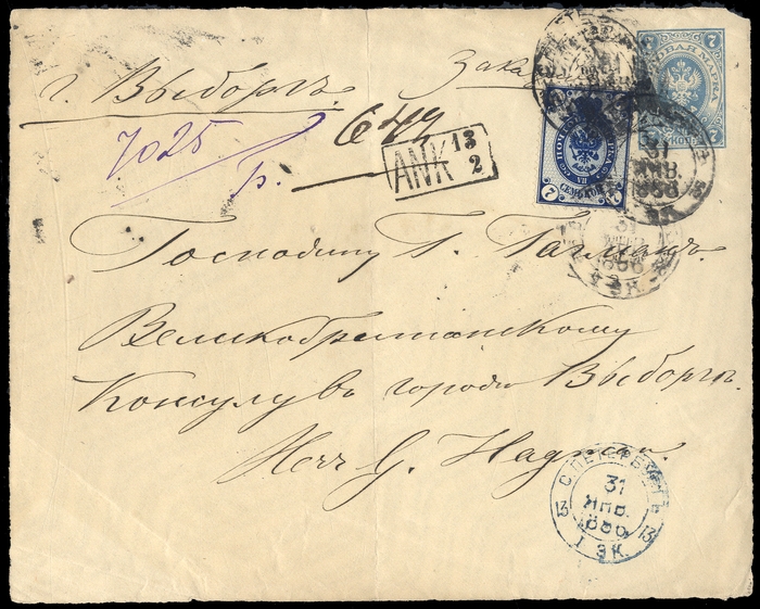 1886, "1.Expedition", auf GS-Umschlag-Vorderseite 7 K. mit 7 K. Zusatzfrank. aus St.Petersburg nach Finnland, Faltung, Beförderungs-und Alterungsspuren