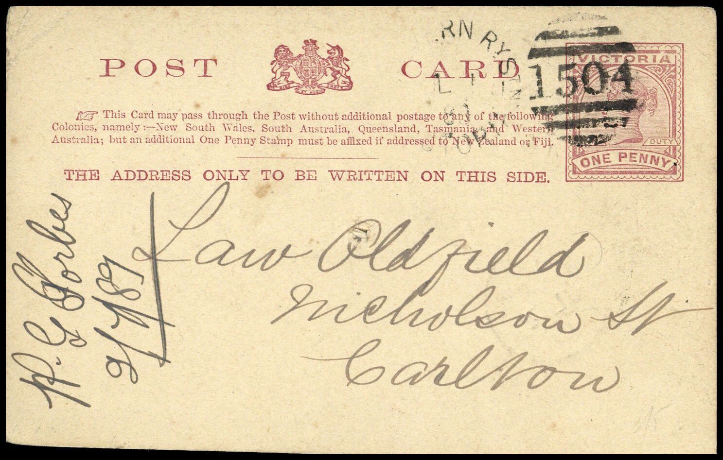 1887, 1 P lilabraun/rahmfarben, GSK Türbogen (124x78 mm, mittig Lochung geschlossen), Duplex ".. RN RY STN JL 1 89/1504", Beförderungs- Altersspuren, via Melbourne, Ak-K1 "CARLTON JL 2 89"