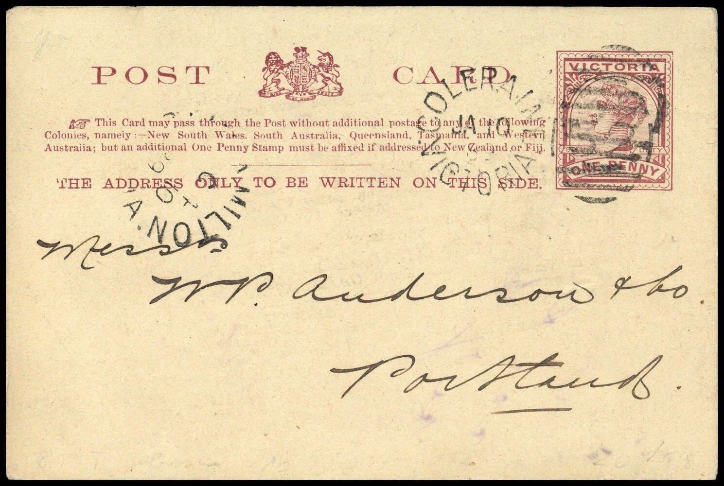 1887, 1 P lilabraun/rahmfarben, GSK Türbogen (124x82 mm), Duplex "COLERAINE JA 10 89 VICTORIA/132", Beförderungs- Altersspuren, rs. Ak-K1 "PORTLAND JA 10 89" und Textrasuren