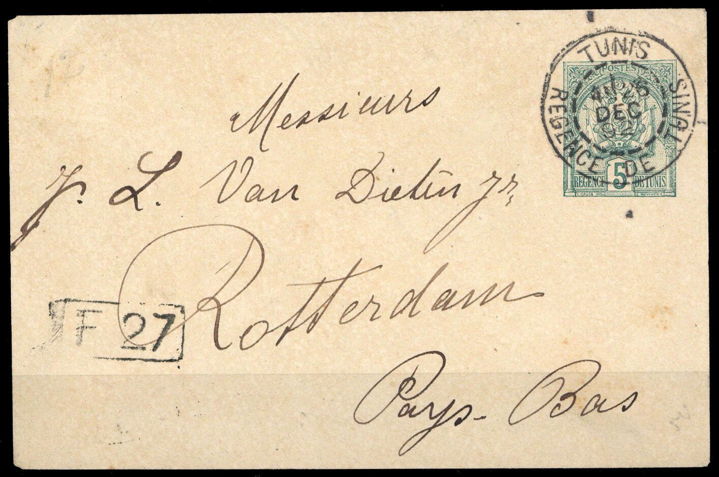 1888, 5 C grün/weiß, GAU Wappen, K2 "TUNIS 26 DEC 92", Beförderungs-, rs. Papierklebespuren, Ak-K2 "ROTTERDAM 29 DEC 92"