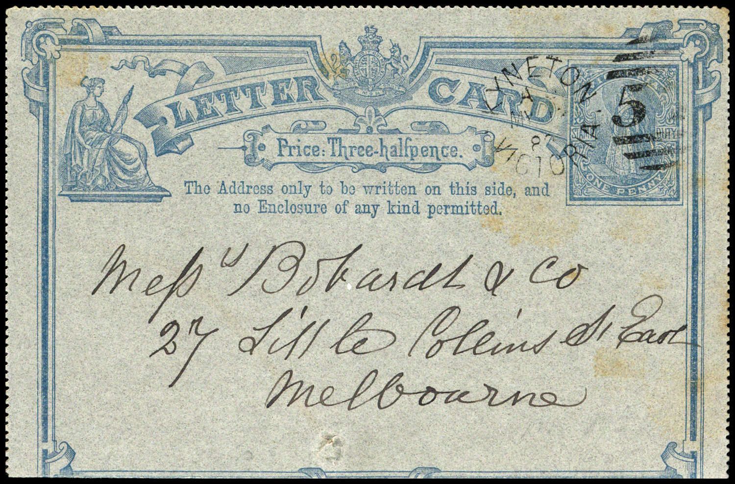 1889, 1 P dunkelblau/dunkelgrau, Kartenbrief Figur Viktoria, ohne Rand, Duplex "KYNETON MY 13 89", im Unterrand Nadellochung, Beförderungs- Altersspuren, Ak "MELBOURNE MY 14 99"