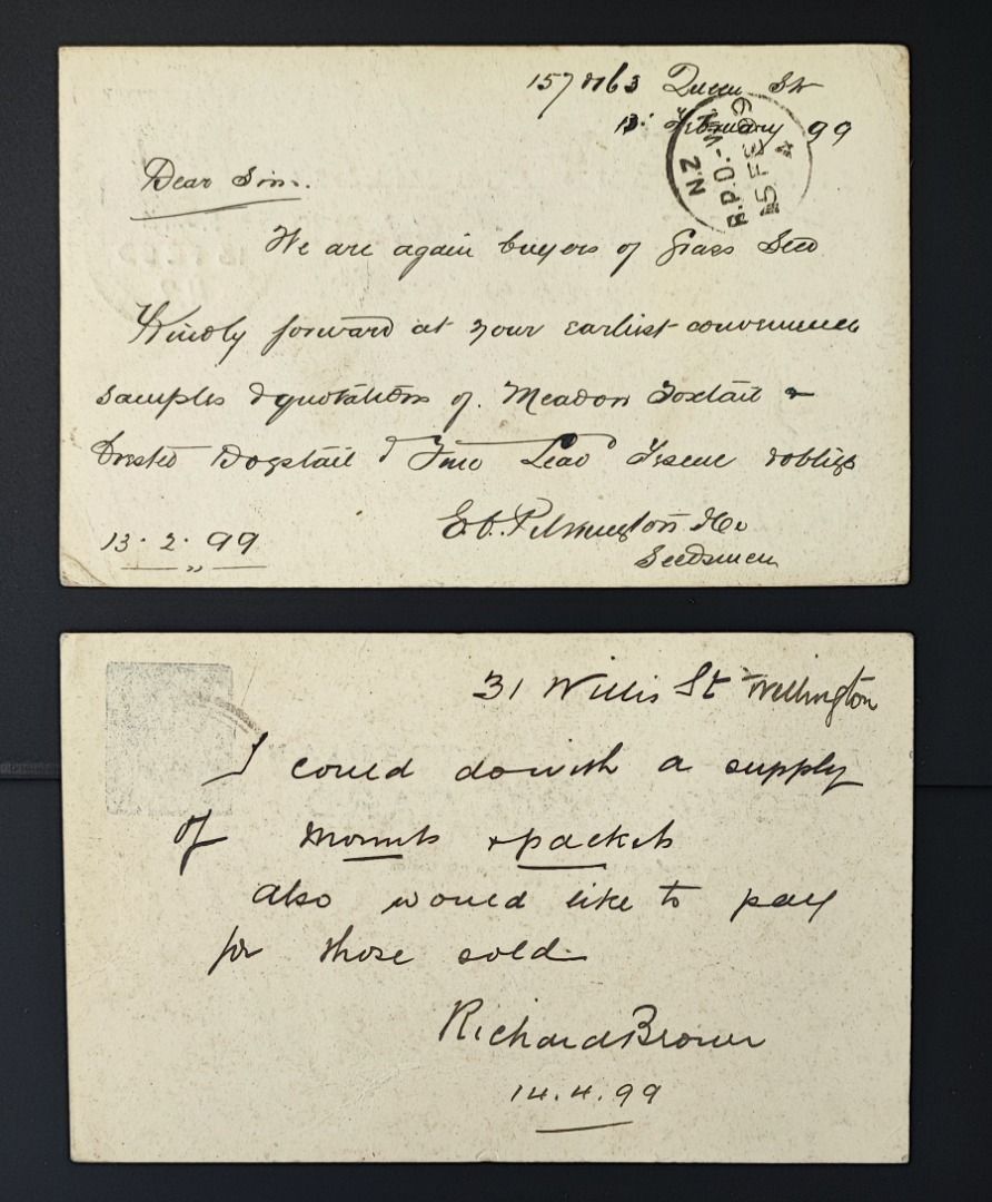 1890/91, 1 P blau, 2 GSK Viktoria, K3 "WELLINGTON 14 AP 99", bzw. "AUCKLAND 13 FE 99", Alters- Beförderungsspuren, je mit Ak Feilding