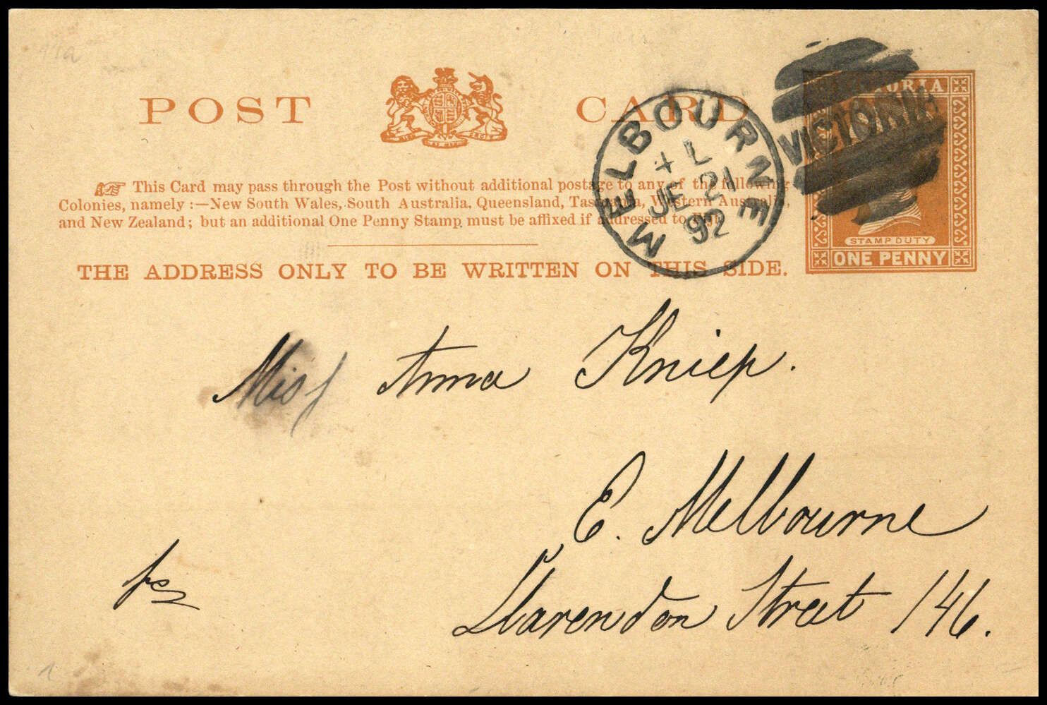 1890, 1 P rotbraun, GSK Hochrechteck, Duplex "MELBOURNE JE 21 92/VICTORIA", rs. ohne Text, Beförderungs- Altersspuren