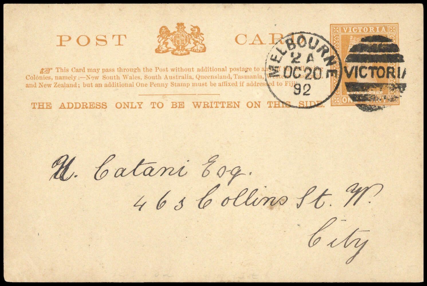 1890, 1 P rotbraun, GSK Hochrechteck, Duplex "MELBOURNE OC 20 92/VICTORIA", rs. Zudruck: Victorian Artists Society .., Beförderungs- Altersspuren (124:82 mm)