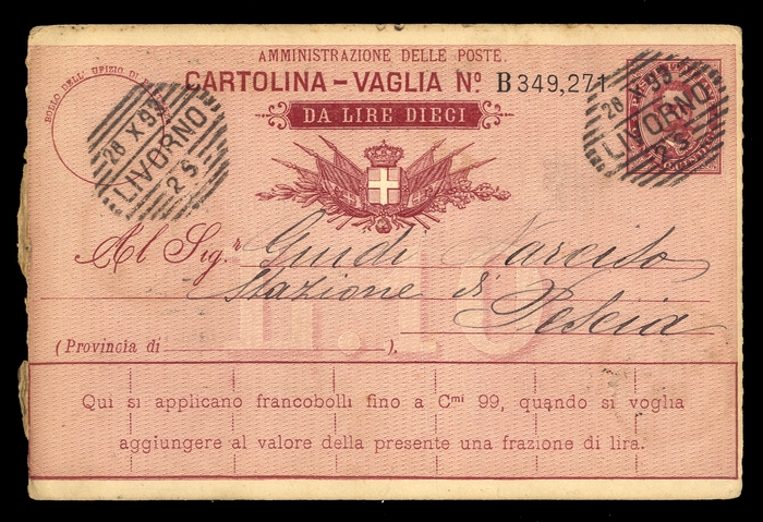 1891, 15 C. Postanweisung "L.10" aus "LIVORNO 28.X.93", nach Pescia Beförderungs-und Alterungsspuren