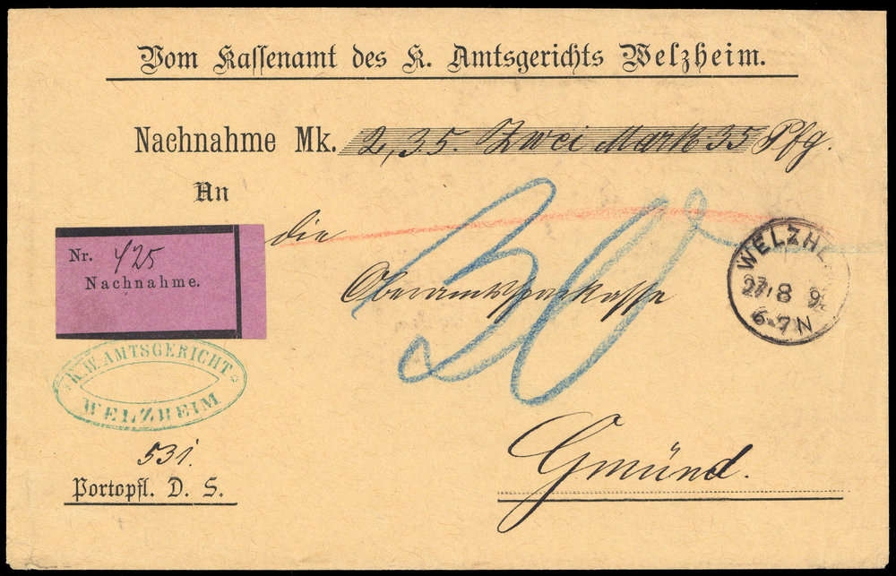 1892, Vordruckbrief (Kassenamt Amtsgericht Welzheim) als Nachnahme mit K1 "WELZHEIM 27.8.92" nach Gmünd, rs. Ankunftsstpl., hds. Vermerke, grüner Briefstpl., Kuvert leichte Bug- und Randspuren.