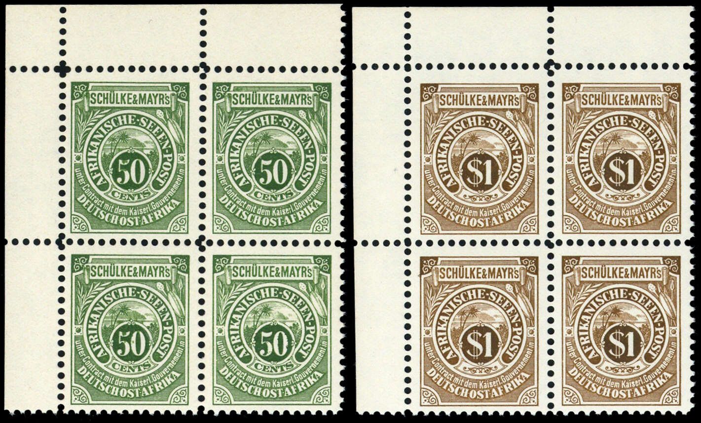 1892, 5 Werte Ostafrikanische Seenpost "Schülke & Mayr" als taufrischer Eckrand 4-er Block- Satz einheitlich links oben tadellos postfrisch im Nachdruck ohne Netzunterdruck (ME 1.200.- ++)