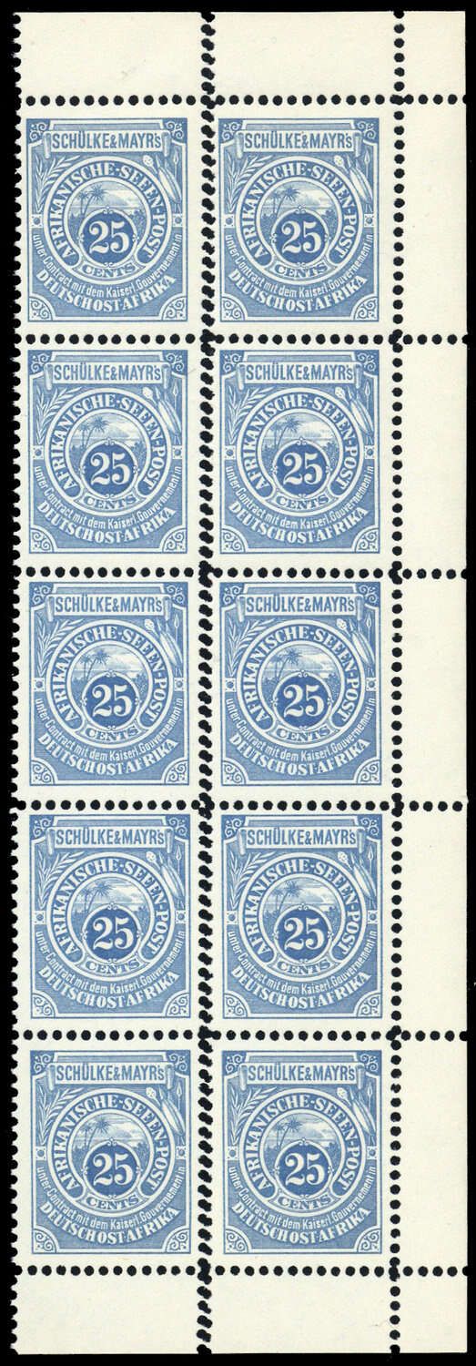 1892, 25 Cent Ostafrikanische Seenpost "Schülke & Mayr" als 10-er Block vom Bogenrand rechts tadellos postfrisch im Nachdruck ohne Netzunterdruck mit einer markanten Doppelzähnung zwischen den 5 senkrechten Markenreihen - äußerst kurios und selten!
