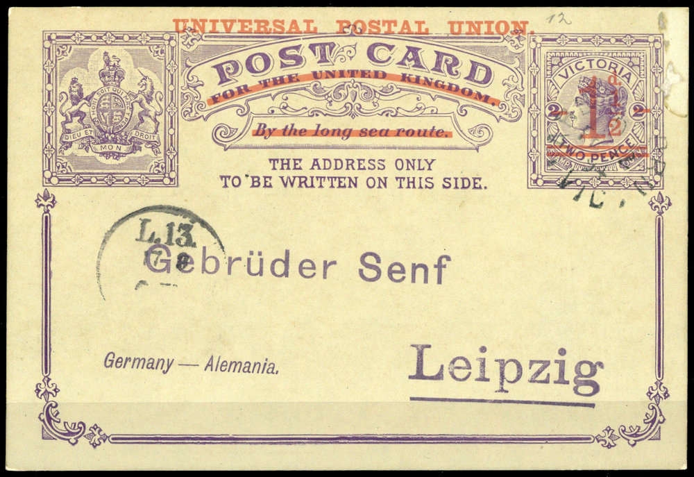 1892, 1 1/2 P rot auf 2 P violett, UPU-GSK, "ABE(RDEEN) FE 12 94 VIC.", Beförderungsspuren, rs. kleine Klebereste, nach Leipzig, K1 "L.13 17/3"