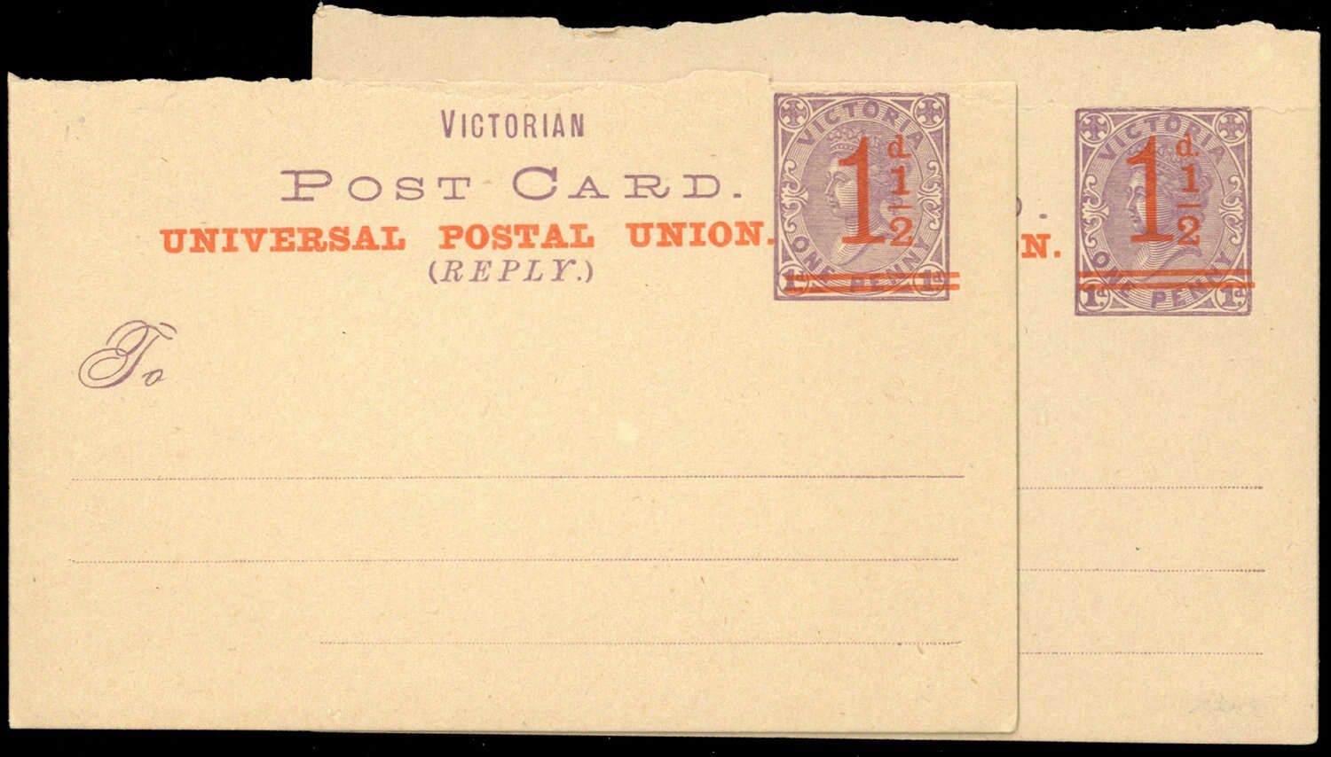 1892, 1 1/2 + 1 1/2 auf 1 + 1 P violett/sämisch, Doppelkarte mit rotem Aufdruck (unsauber durchtrennt), ungebraucht, Altersspuren