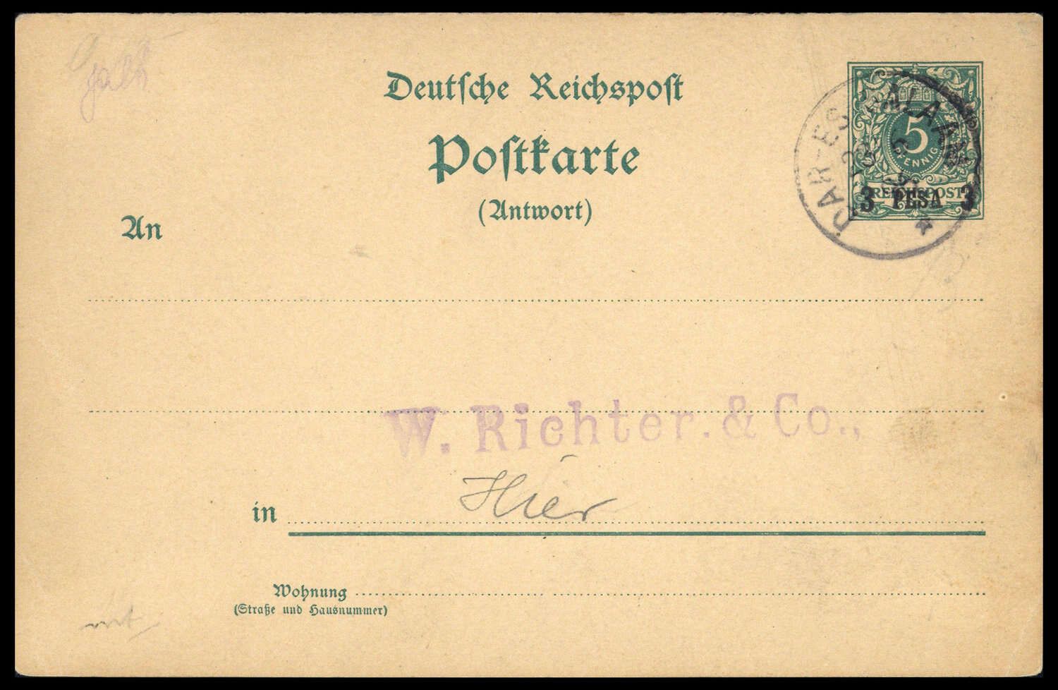 1893, 3P.a.5Pfg. Krone/Adler - Antwort-Ganzsache von DAR-ES-SALAAM 23.6 96 nach DAR-ES-SALAAM, Alterungsspuren, kein rs. Text.