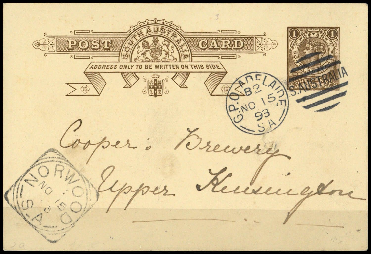1893, 1 P dunkelbraun/sämisch, GSK Viktoria ohne Umrandung, Duplex "G.P.O. ADELAIDE NO 15 93", Beförderungs- Altersspuren, Quadrat-Ak "NORWOOD NO 15 (9)3"