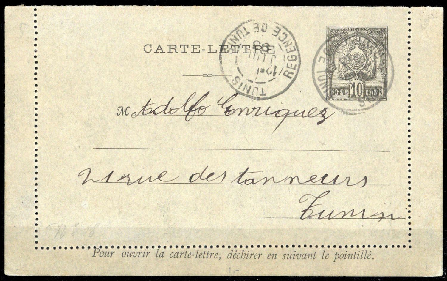 1893, 10 C schwarz/dunkelgrau, Kartenbrief Wappen mit Rand, K2 "TUNIS .. JUIL 93", Alters- Beförderungsspuren, Ortsverwendung