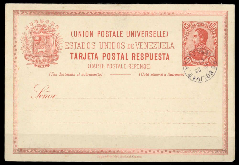 1893, 10+10 C ziegelrot/rahmfarben, Doppelkarte Bolivar, etwas angetrennt, gestützt, Blanko-K1 "VALENCIA ABR 29 97", Altersspuren