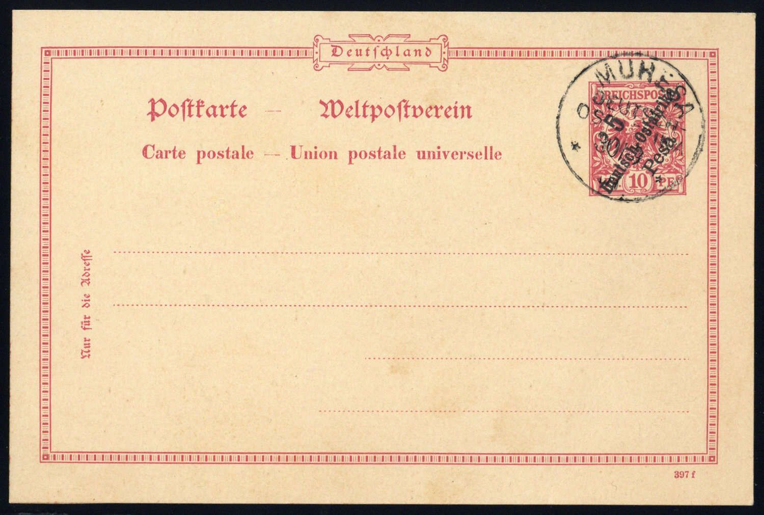 1896, 5P.a.10Pfg. Krone/Adler-Aufdruck, ungebrauchte Ganzsache mit K1 "MUHESA DEUTSCH-OSTAFRIKA 30/9", leichte Spuren.