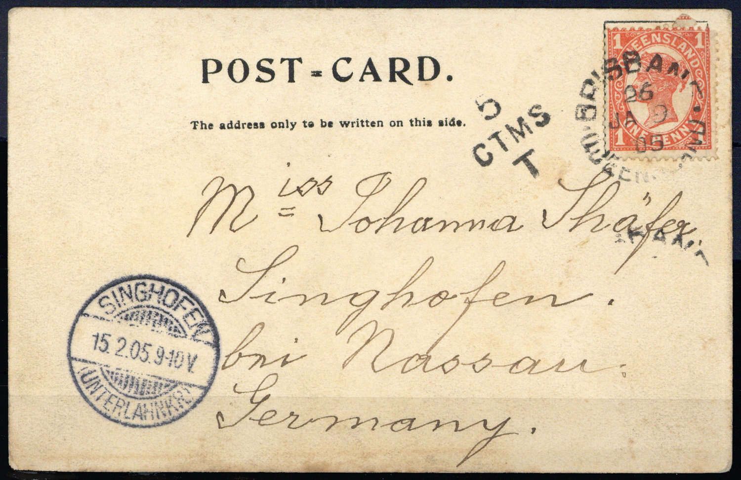 1897, 1 P ziegelrot, gestempelt "BRISBANE JA 9 05", sw AK (Pferderennen), L3 "5/CTMS/T", Alters- Beförderungsspuren, Ak-DB "SINGHOFEN 15.2.05/D