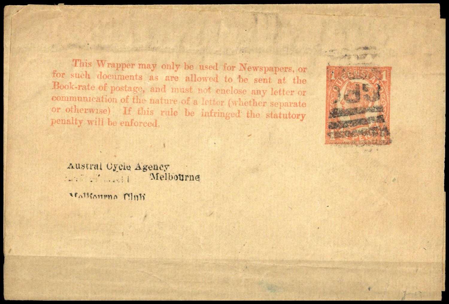1897, 1 P fleischrot, Streifband Viktoria, Balkenstempel, waagerechte Faltungen, Alters- Beförderungsspuren, nach Melbourne