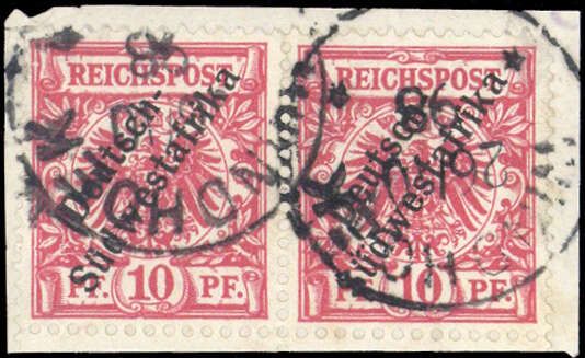 1898, 10 Pfg. Deutsches Reich Krone/Adler mit Aufdruck im Paar auf Briefstück und einmal der Druckzufälligkeit "Kerbe im linken Rahmen oben"