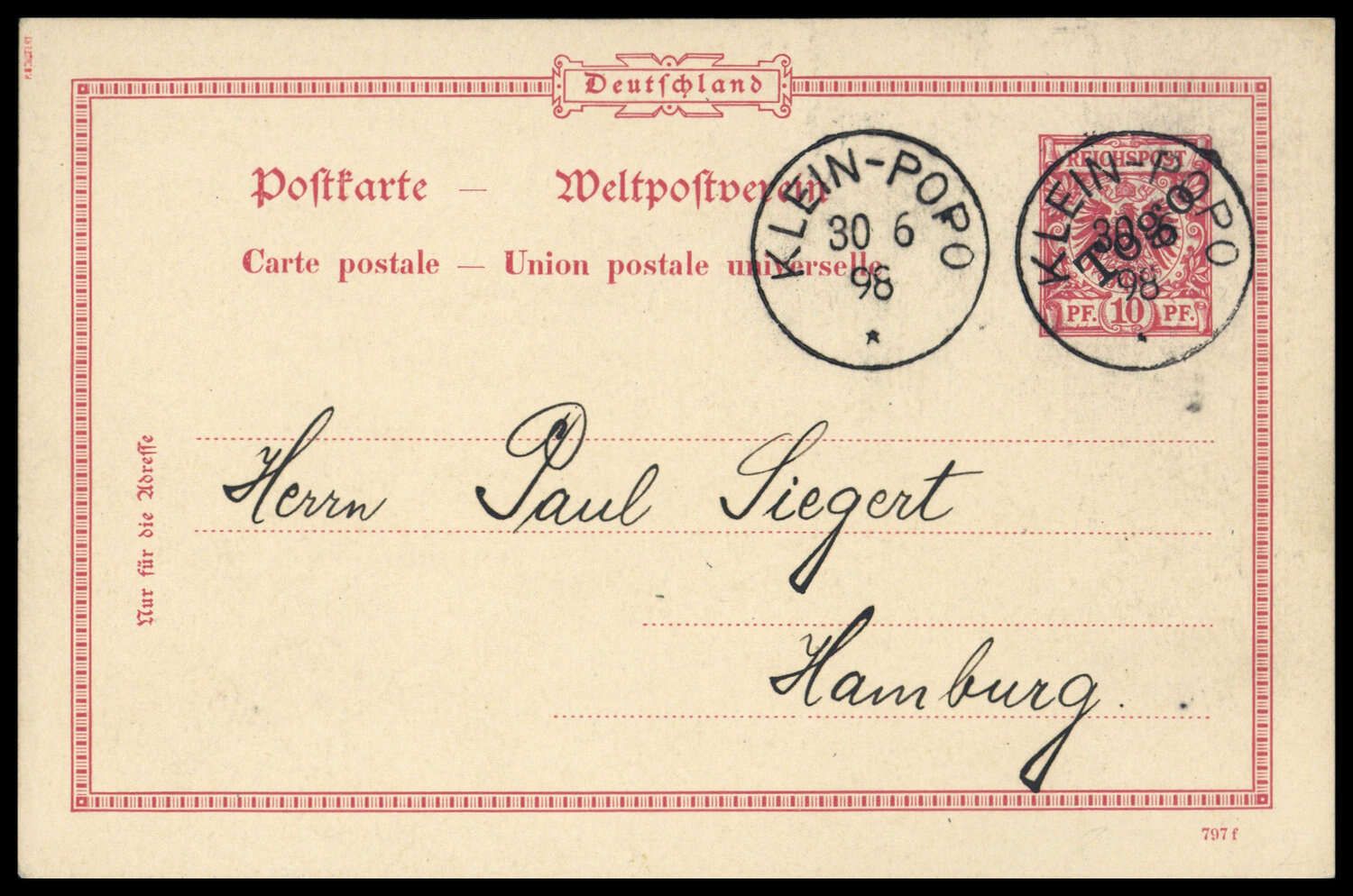 1898, 10 Pfg. Krone/Adler - Ganzsache mit zweimal Stpl. "KLEIN-POPO 30 6 98" nach Hamburg, kein rs. Text.
