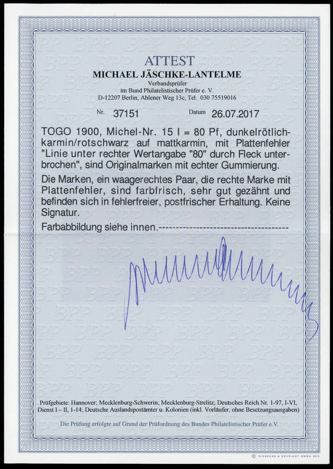 1900, 80 Pfg. kaiseryacht als postfrisches Luxuspaar mit einmal dem seltenen Plattenfehler "Linie unter 80 unterbrochen". Aktuelles Farbfotoattest Jäschke- Lantelme vom 26.07.2017 in der höchsten Qualitätsstufe "echt und einwandfrei" (ME 600.-)