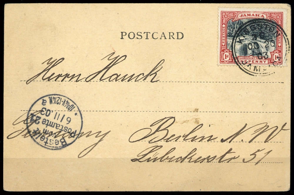 1900, 1 P Wasserfall, K2 "KINGSTON OC 20 03", sw AK (Kingston, King-Street), Beförderungs- Altersspuren, nach Berlin