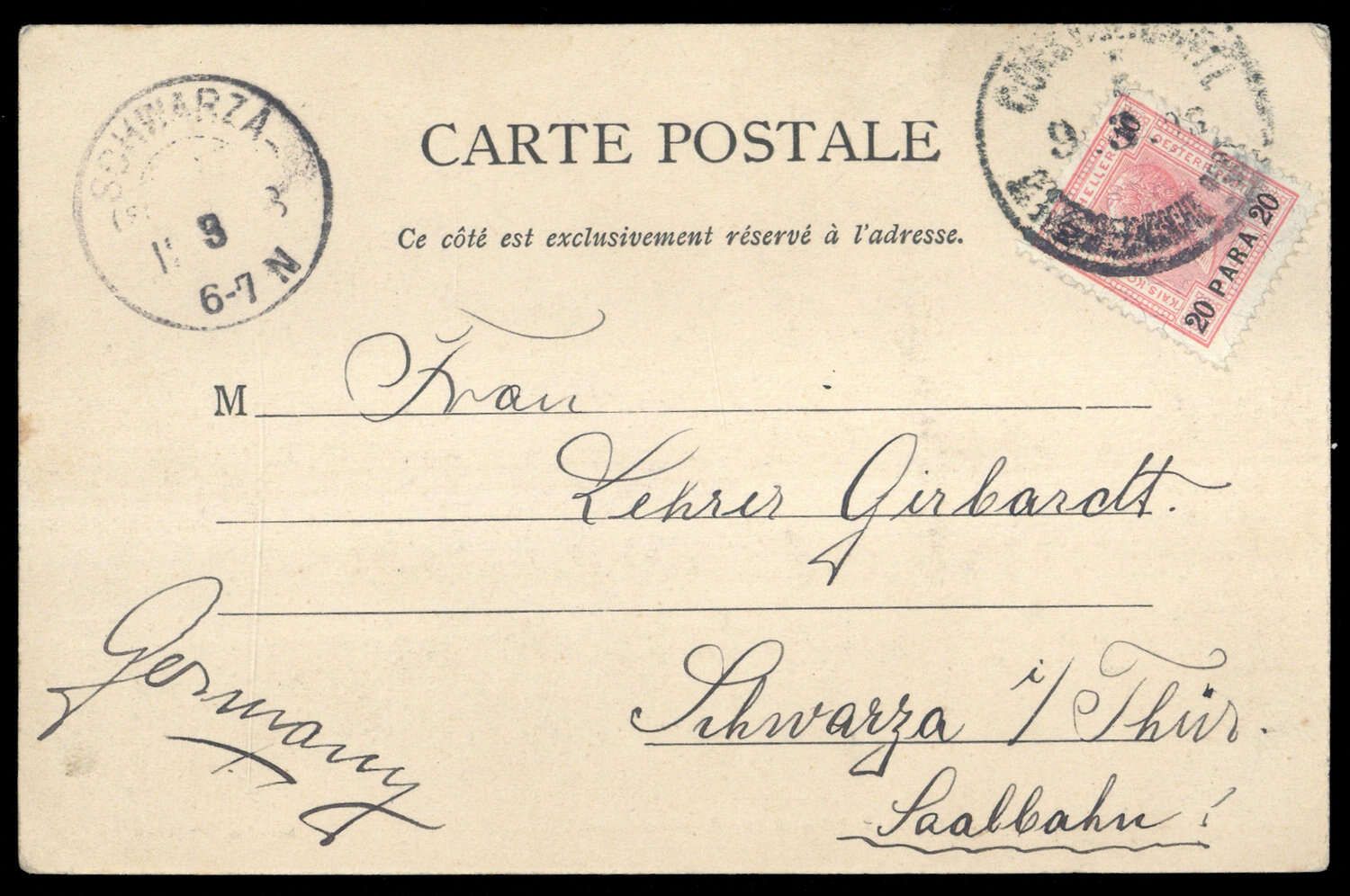 1900, 20 PA auf 10 H rosa/schwarz, K1 "CONSTANTINOPEL 9.3.03", sw AK (Moschee Sultan Ahmed), Alters- Beförderungsspuren, Ak "SCHWARZA 12 3 03"