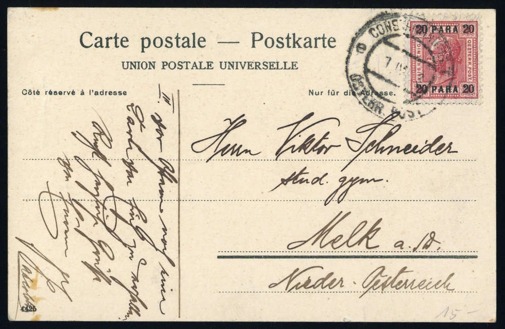 1900, 20Pa.a.10H. Kaiser Franz Joseph auf farbiger Postkarte von CONSTANTINOPEL 7.IX.00 nach Melk / Nieder-Österreich, rs. Alterungsspuren.
