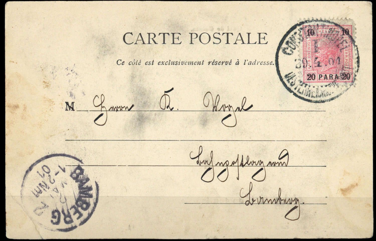 1900, 20 Pa karmin/schwarz (eckrund), K1 "CONSTANTINOPEL I 29.4.01", sw AK (Quai de Galata), Bug, Alters- Beförderungsspuren, Ak-K1 "BAMBERG 2 MAI 01"