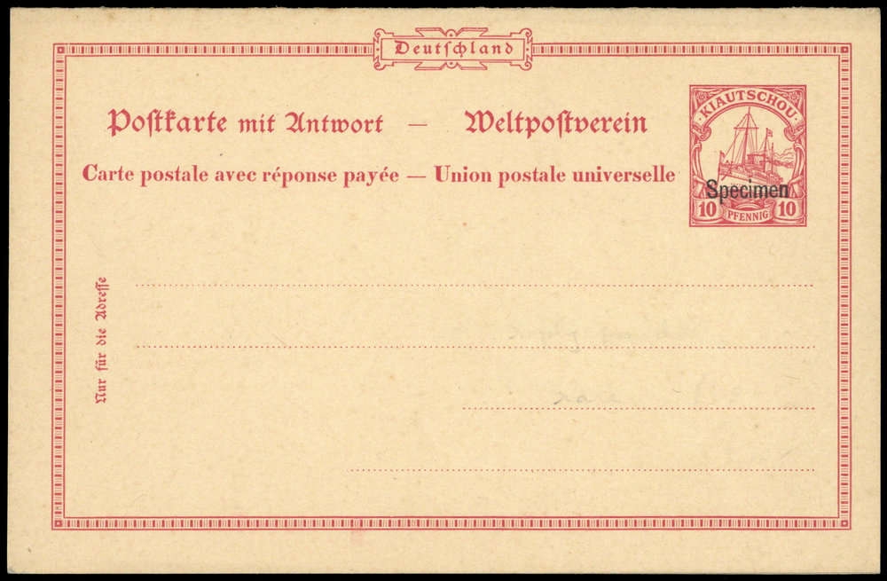 1901, 10 Pfennig Kaiseryacht "Hohenzollern" Ganzsache taufrisch ungebraucht mit Frage- und Antwortteil als seltener Probedruck mit 74 statt 70 mm langer vierter Punktlinie und Aufdruck "Specimen"