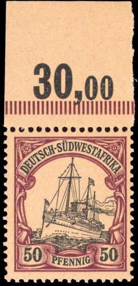 1901, 50 Pfg. Kaiseryacht als postfrisches ndgz. Platten- Oberrandstück