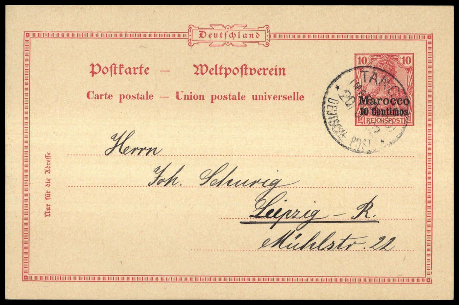 1902, 10C.a.10Pfg. Germania, Ganzsache von TANGER (MAROKKO) 20/3 02 DEUTSCHE POST nach Leipzig, kein rs. Text.